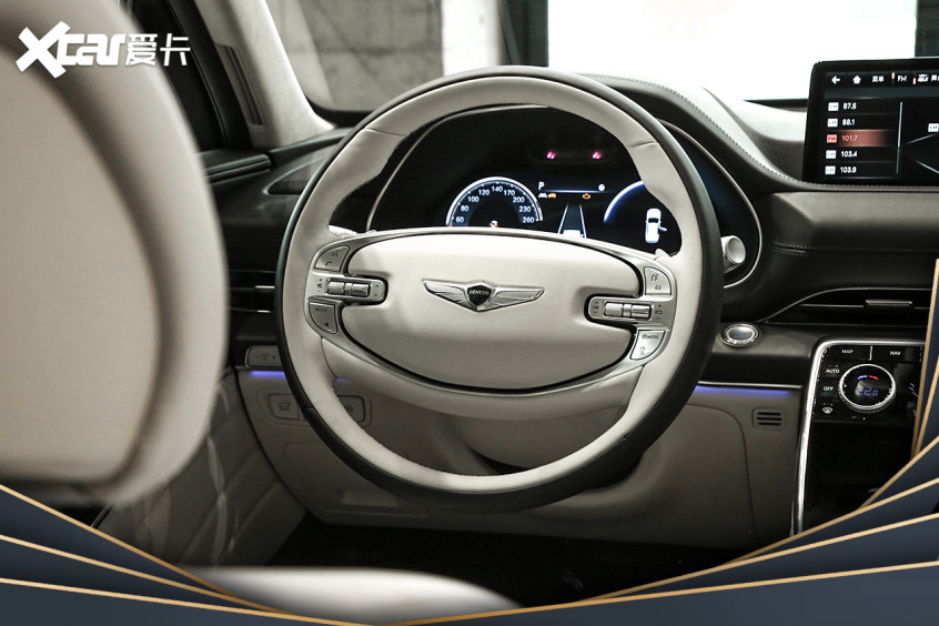 如果说四辐式方向盘代表稳重和豪华,三辐式方向盘代表运动。那么我认为,捷尼赛思GV80上的双辐式方向盘则是在向经典致敬。七八十年代豪华车的经典设计,如今被真皮材质完美包覆,呈现出的美感不言而喻。