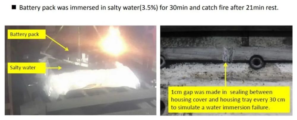 昨天的材料主要讨论的是电池包密封的普遍情况,今天补充一些材料和大家分享:如果电动汽车的电池进水了会怎么样。这个方面的研究,主要是在EVS里面进行,材料来源一方面是中国的研究团队和韩国的KATRI研究所的Bohyun Moon的实验。