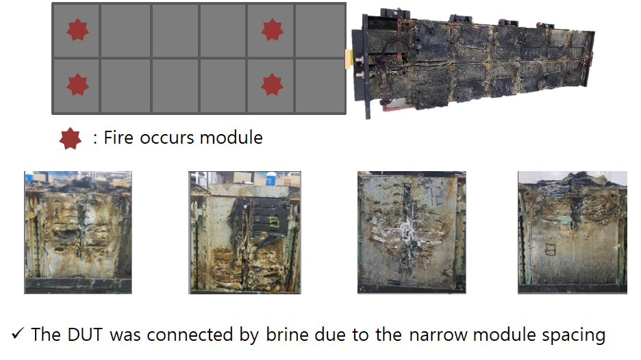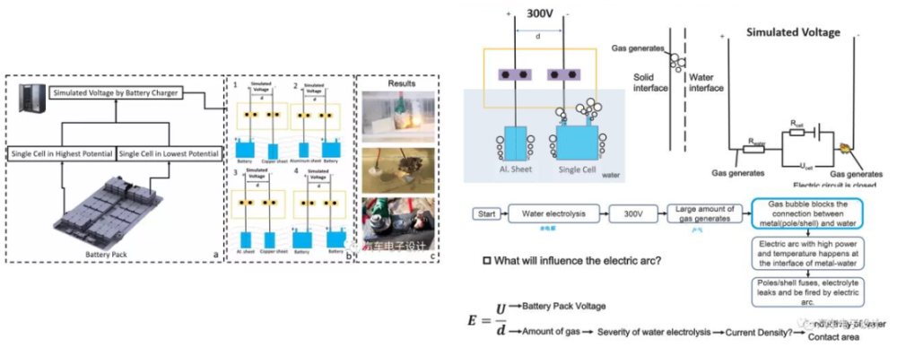 论文中分析得到的原因是:电池系统在浸没之后,由于电解水的反应会产气,在高压连接气体的运动下产生通断,使得连接的地方产生电弧。如果在全部浸入之后,电弧可能引起电池起火。最主要的是,当接触器两端正负极间距处于比较近的状态,以及在集中式BMS采样汇集处,这些部分在盐水里面就能形成回路,比如:接触器正负极之间、BMS的高压采样段正负极之间,和模组汇集电压的CMU等几个地方。如果是泡在洪水中,由于水中杂质较多,一旦电池进水,内部很容易烧蚀。