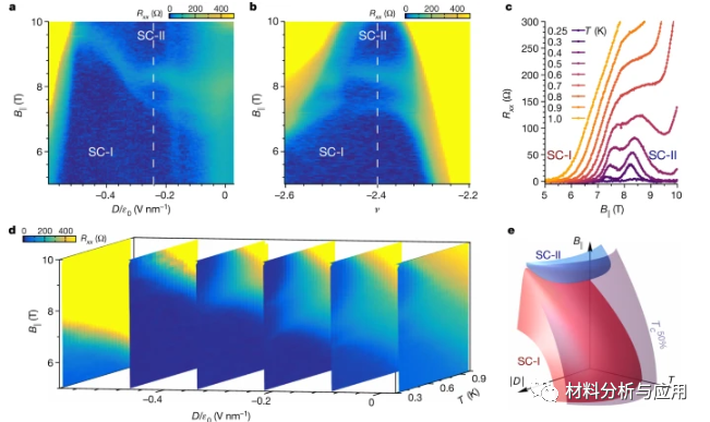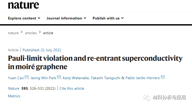 本文,麻省理工学院曹原, Jeong Min Park, Pablo Jarillo-Herrero等研究人员在《Nature》期刊发表名为“Pauli-limit violation and re-entrant superconductivity in moiré graphene”的论文,研究对石墨烯中加入超过10T的面内磁场,魔角石墨烯仍能够保留其超导性质,这个现象是经典自旋单重态超导体所容忍的Pauli极限的2-3倍,这种超过经典Pauli极限的现象伴随着超导相的形成而存在,这种效应排除了超导放大成对效应导致形成的赝相。