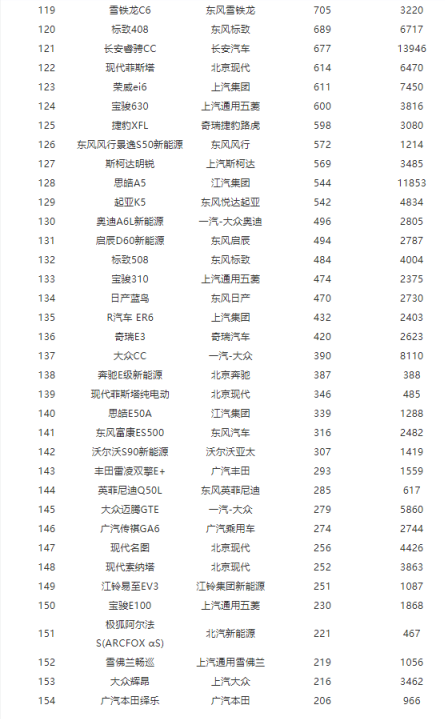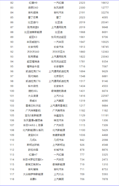 排名93-118,排在首位的是国产红旗H9,已月销2323台。大众新能源帕萨特排在了这份榜单的倒数第二。几何A车型之后是本月销量都是没有过千台的车型。