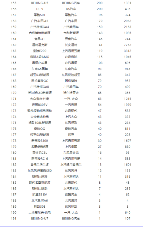 排名11-44,这个排名中没有本田雅阁和大众帕萨特是不是感觉很怪,丰田的凯美瑞可是进了前十,而日产天籁已本月销量9664台排在19位,亚洲龙已本月销量6807台排在第33位。雅阁和帕萨特是不是已经在墙角哭泣了?