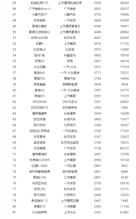 排名45-81,哦吼!本田雅阁和帕萨特出现了,雅阁销量3138辆,帕萨特销量2347辆,分别排在70位和81位。帕萨特排在最后一位,我可没有特意针对TA。