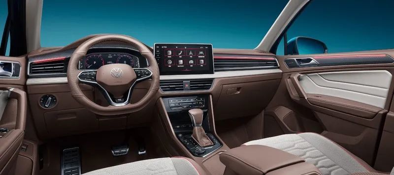 内饰部分新途观家族和现款相比变化显著,全新的设计和布局显得更加年轻时尚,缓解了大众家族内饰千篇一律的审美疲劳。全新12英寸悬浮中控屏幕、30色氛围灯的引入,都提神了新车内饰的科技氛围。