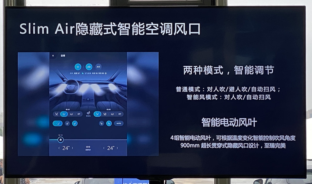 贯穿式的空调出风口融入了自动扫风的功能,取消了传统的手动风叶,通过自动的方式,可以实现对人吹/自动扫风的功能,当然中控屏内也可以控制风向,类似于特斯拉。