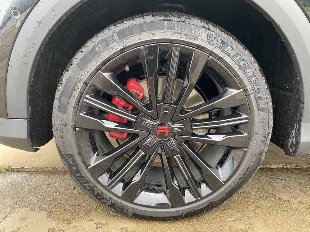 235/45 R19的轮胎规格正正好,无论高低配都是这个尺寸。拍摄车辆黑化的轮毂颜色搭配红色的刹车卡钳,自带黑武士风格,避免黑色轮毂改色的麻烦。不过,我还是更喜欢这套蓝色和银色搭配的五幅式轮毂,可能是对新能源车型的执念,不爱绿色独爱蓝色,我记得岚图Free的蓝色轮毂也给我留下了很深的印象。