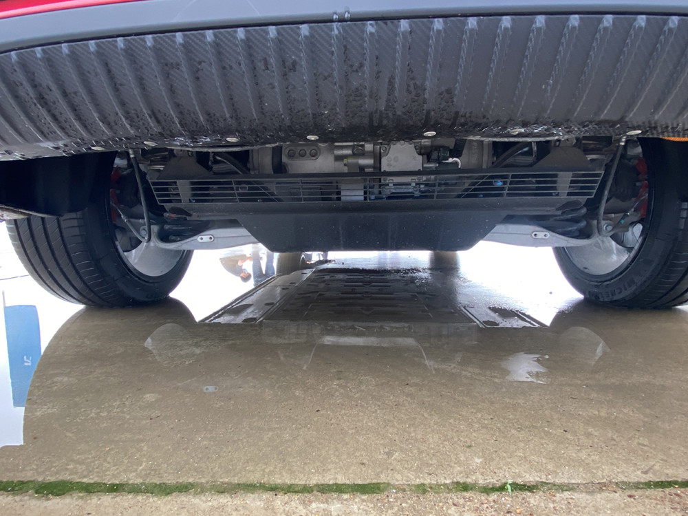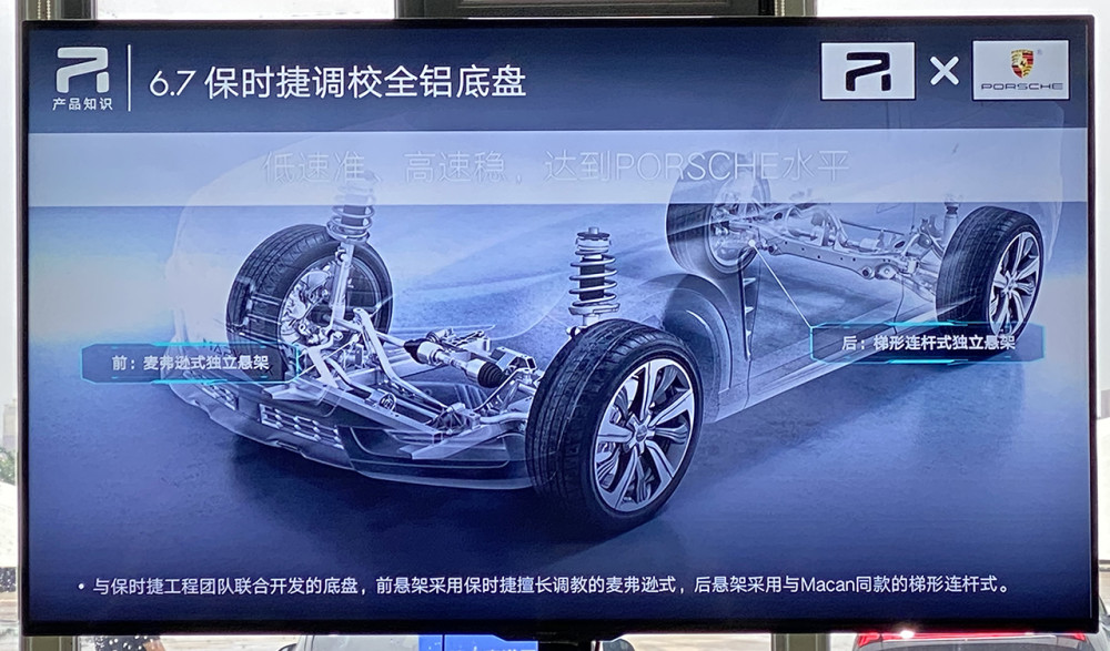 在过枕木路时,底盘的调校确实很出色。不禁让我想到在产品沟通会上,负责人说Marvel R是全铝底盘,并且由保时捷团队调校,我微微一笑。因为现在有太多车企说自己的底盘调校是由保时捷来负责,比如说某鹏的产品。Marvel R的前悬为麦弗逊式独立悬架,后悬为梯形连杆式独立悬架,划重点,后悬架采用与保时捷Macan同款结构。