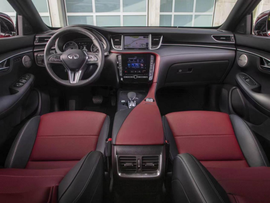 内饰部分,QX55表现的中规中矩,中控区域的上下双屏没有什么新意,中控台和座椅的红黑双拼色设计看起来精致时尚,整体的用料和做工也都符合豪华品牌的水准。整体的空间表现中规中矩。