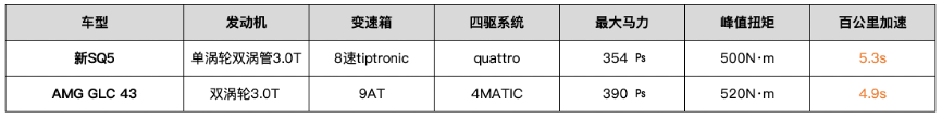 详细对比之下,新款SQ5搭载单涡轮双涡管3.0T发动机,最大马力354匹,峰值扭矩500牛·米,匹配8速tiptronic变速箱和机械quattro全时四驱系统,零百加速5.3秒;AMG GLC 43则搭载双涡轮3.0T 发动机,最大马力390匹,峰值扭矩520牛·米,匹配9AT变速箱和4MATIC四驱系统,零百加速4.9秒