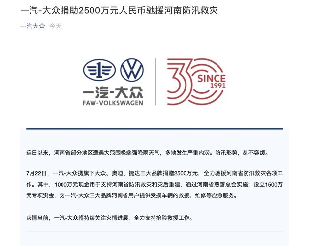 7月22日,一汽-大众携旗下大众、奥迪、捷达三大品牌捐赠2500万元,全力驰援河南省防汛救灾各项工作。其中,1000万元现金用于支持河南省防汛救灾和灾后重建,通过河南省慈善总会实施;设立1500万元专项资金,为一汽-大众三大品牌河南省用户提供受损车辆的救援、维修等应急服务。