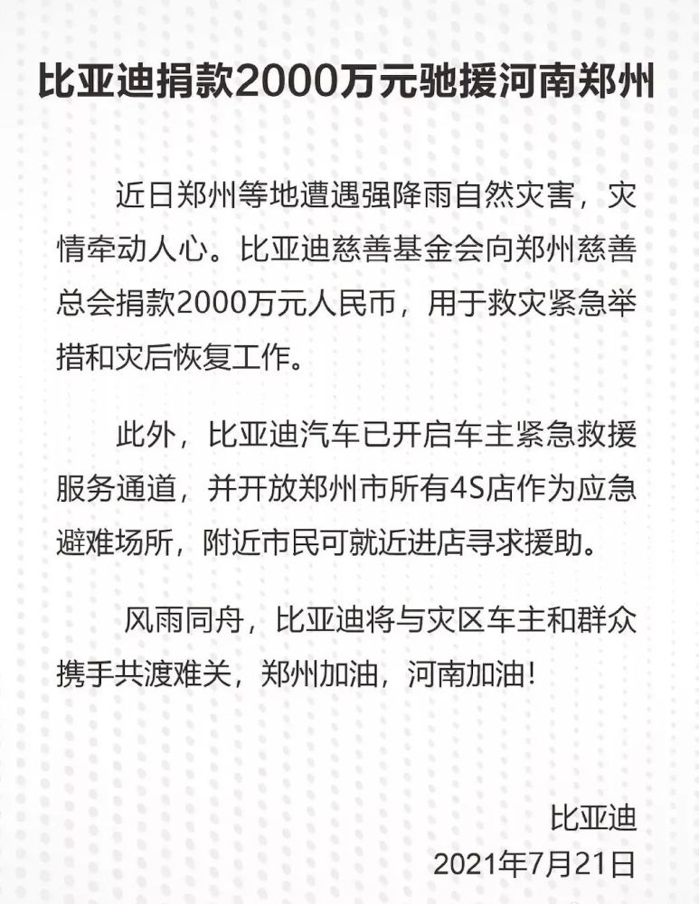 7月21日,比亚迪慈善基金会向郑州慈善总会捐款2000万人民币,用于救灾紧急举措和灾后恢复工作。此外,比亚迪汽车已开启车主紧急救援服务通道,并开放郑州市所有4S店作为应急避难场所,附近市民可就近进店寻求援助。