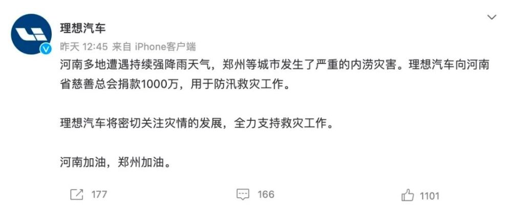 7月21日,理想汽车宣布向河南省慈善总会捐款1000万元,用于防汛救灾工作。