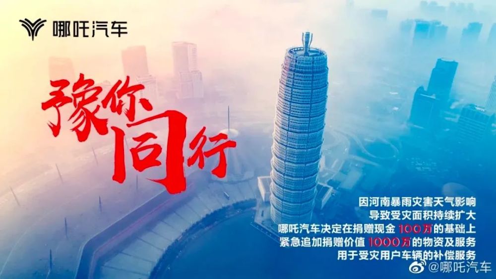 7月21日,哪吒汽车官宣向河南省慈善总会捐款100万元,用于防汛救灾工作。同时,向河南省的哪吒汽车用户作出五大承诺,保障用户安心用车。7月22日,哪吒汽车表示在此基础上,紧急追加捐赠价值1000万的物资及服务,用于受灾用户车辆的补偿服务。