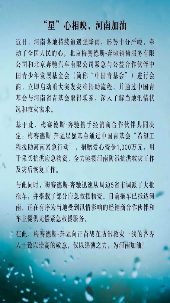 7月21日,梅赛德斯-奔驰官宣,梅赛德斯奔驰星愿基金通过中国青基会“希望工程援助河南紧急行动”,捐赠爱心资金1000万元,用于采买抗洪应急物资,全力驰援河南防汛抗洪救灾工作及灾后恢复工作。同时,梅赛德斯-奔驰从周边5省市调派了大批拖车,并搭载了部分应急救援物资。正在有序的为当地收到汛情影响的经销商合作伙伴和车主提供无偿紧急救援服务。