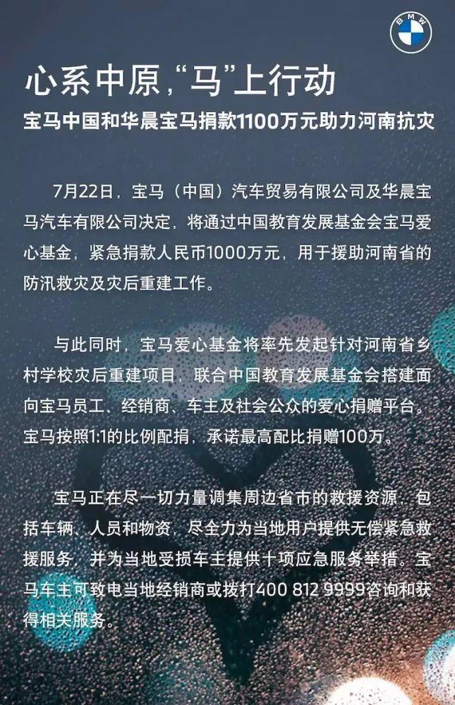 7月22日,宝马(中国)汽车贸易有限公司及华晨宝马汽车有限公司决定,将通过中国教育发展基金会宝马爱心基金,紧急捐款1000万元,用于援助河南省的防汛救灾及灾后重建工作。同时,宝马爱心基金也将率先发起针对河南省乡村学校灾后重建项目,联合中国教育发展基金会搭建面向宝马员工。经销商、车主及社会公众的爱心捐赠平台,宝马按照1:1比例配捐,承诺最高配比捐赠100万。而对于河南省的用户,宝马还为当地受损车主提供十项应急服务举措。