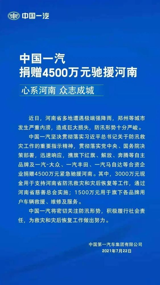 7月22日,中国一汽宣布,携旗下红旗、解放、奔腾等自主品牌以及一汽-大众、一汽丰田、一汽马自达等合资企业捐赠4500万紧急驰援河南。其中,3000万元现金用于支持河南省防汛救灾和灾后恢复等工作,通过河南省慈善总会实施;1500万元用于旗下各品牌用户车辆救援、维修及服务。