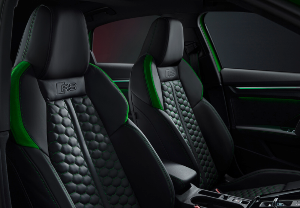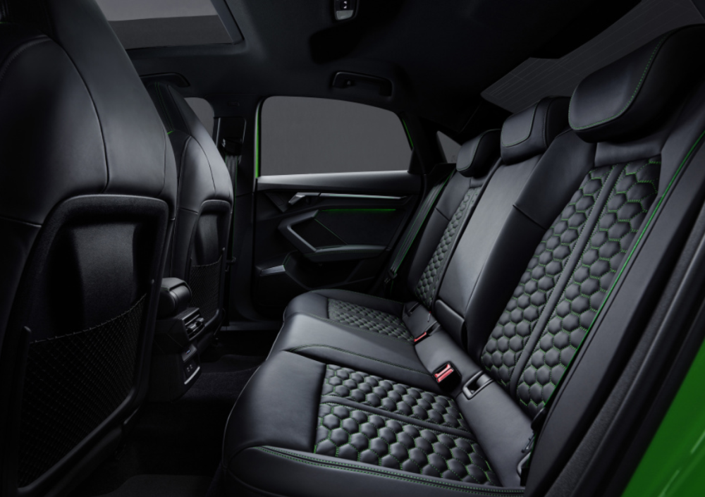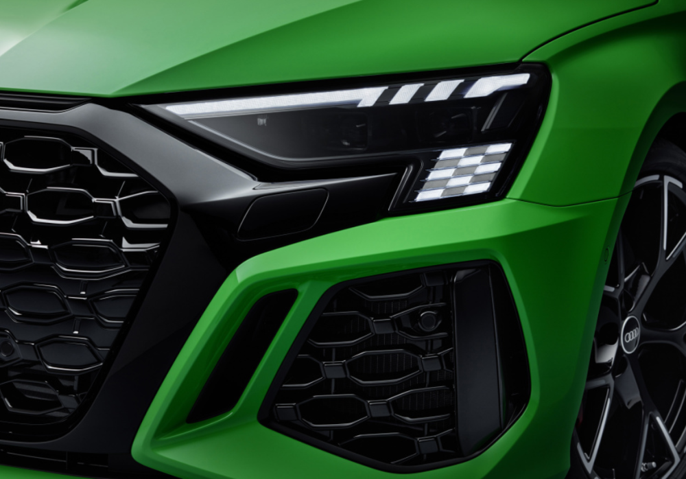 车身结构采用的是三厢版的设计,更加符合国人审美的同时,也带来了比较优秀的视觉氛围。车尾的层次感相当丰富,后扰流板微微上翘,同时还加入了黑色的碳纤维饰板,蜂窝状结构带来了十分炸裂的视觉效果。在大灯灯组方面,奥迪是没有什么可以挑剔的,前大灯灯组采用的是矩阵式的LED大灯,并且还首次采用了数字LED日间行车灯,行车灯采用的则是3X5 LED灯组,仪式感极强,熏黑式尾灯还融入了贯穿式的光带,酷炫感十足。在迎宾模式的情况下,驾驶员一侧的日行灯还会变成RS 3的字样,在行车的过程之中也会展示出赛车车旗的图案。