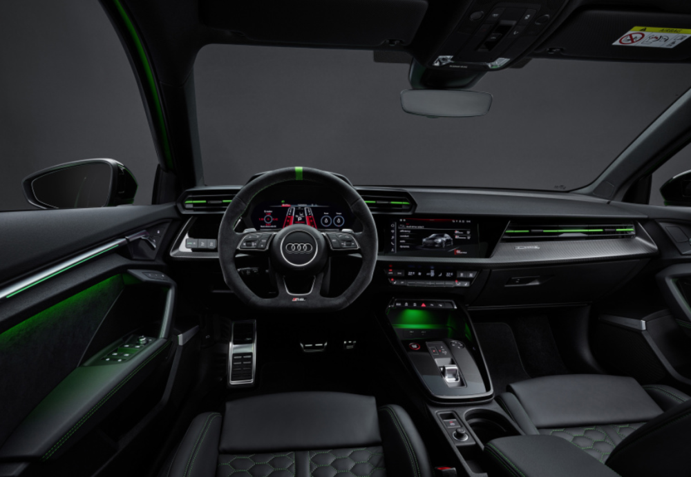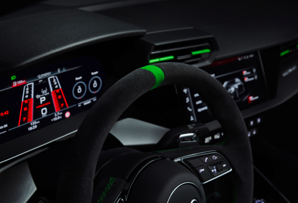 跟外观对比起来,全新奥迪RS 3的内饰设计看上去更加的激进和富有运动气息,虚拟座舱是必不可少的一个元素。中控台偏向了驾驶员一侧,12.3英寸的全液晶仪表盘和10.1英寸+8.6英寸的触控式中控大屏都是全系标配,科技氛围十足。车内的用料也相当厚道,采用的基本上都是Alcantara的面料进行包裹,在中控台的周围也配上了碳纤维的饰板以及镀铬元素,整车的质感非常强。