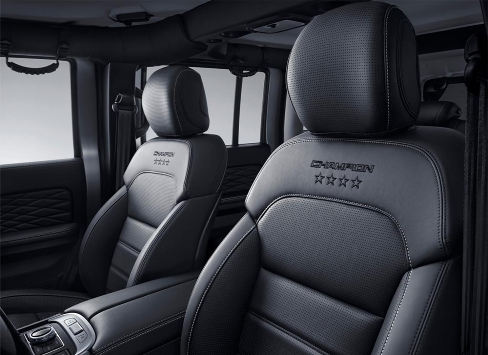内饰部分,沿用了家族元素的12.3英寸的全液晶仪表和10.25英寸的中控大屏。带有电控差速锁“电子预锁止功能”按键的四驱分动控制面板让新一代BJ40环塔冠军版在越野挑战中可以一键轻松脱困。值得一提的是,车内的野性氛围也营造得不错,作为新增车型,针对细节方面进行调整。具体来看,新车采用了深色的色调方案,其中控台诸多部位加入镀铬元素进行点缀,搭配带有缝线的座椅,以及液晶仪表采用环塔专属主题,中控同样拥有专属画面,专属LOGO,值得期待的是,每一台“暴风”的编号也是唯一的,同时副驾手套箱部位带有环塔图案和“CHAMPION”标识,座椅刺绣着“CHAMPION”字样和四星图案,从而很好地表现它的独特性,也符合它自身的定位。