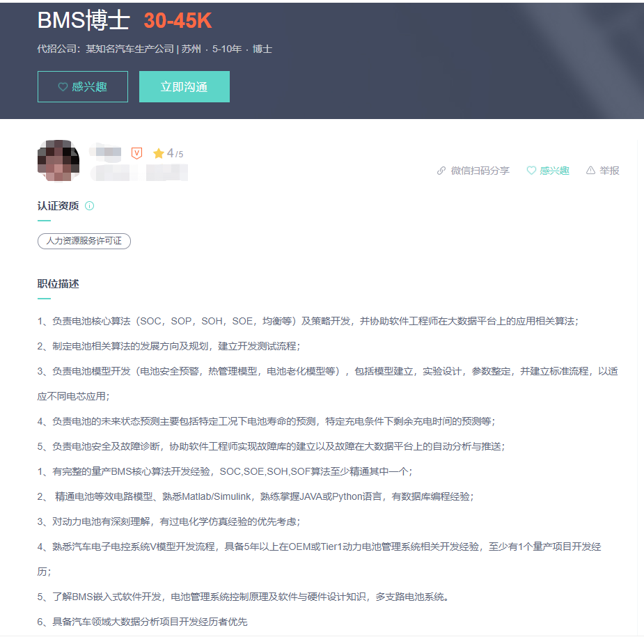 在某招聘网站上搜索“电池管理系统BMS”类工作岗位需求量达到500+,学历要求最低大专水平。