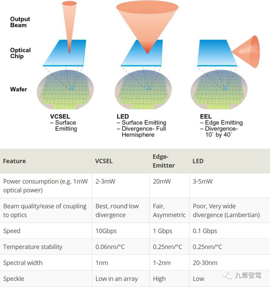 红外LED作为光源,虽然成本低,但LED没有谐振腔,光束发散,必须输入更多的电流并克服损失,因此功耗较高。此外,LED不能快速调制,限制了其分辨率。相比于红外LED和EEL,VCSEL的出射光更集中、光斑更对称,同时在温度漂移和腔面反射率上也更占优势,VCSEL还能够实现二维阵列。