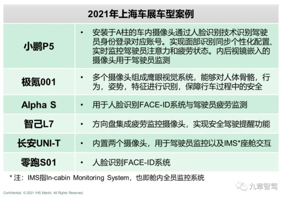 2021年上海车展期间,多款新车都将标配DMS,这成为DMS技术发展的风向标。部分车型已经将DMS与OMS组合起来,座舱内从以驾驶员监测为中心向舱内全员监测发展。