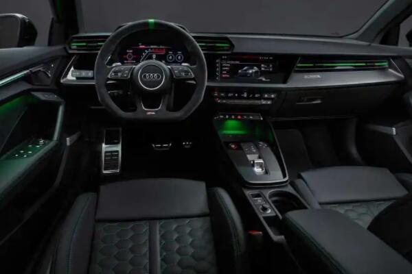 内饰方面,整车的风格还是以往大家熟悉的样子。还用了很多碳纤维的饰板进行装饰用。新车的用了12.3英寸的液晶仪表盘和10.1英寸的中控屏,全新一代奥迪RS3是一款性能车,方向盘用的是翻毛皮质的专属方向盘设计。为内饰增加了不少运动氛围感。