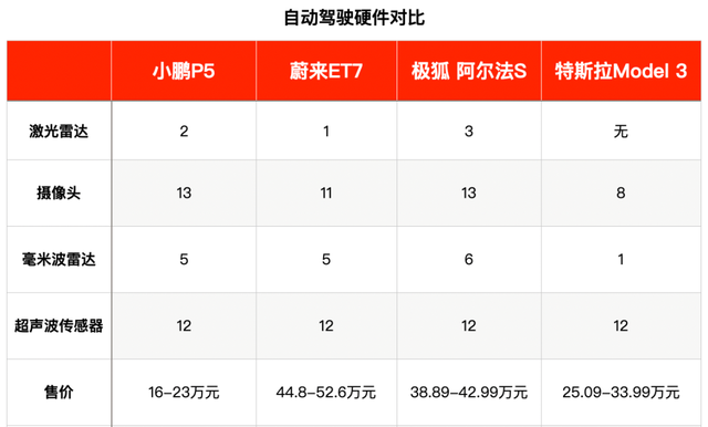 这一下子就让这台新车的性价比变得尤其突出了,要知道目前在国内市场,除了小鹏P5以外,还有诸如已经亮相但仍未正式上市交付的蔚来ET7以及极狐阿尔法S这两款车型是确定会采用激光雷达的。但是蔚来ET7的预售价高达44.8-52.6万元,而搭载华为激光雷达的极狐阿尔法S HI版的预售价也要38.89-42.99万元,相比之下小鹏P5的价格无疑是要亲民得多。