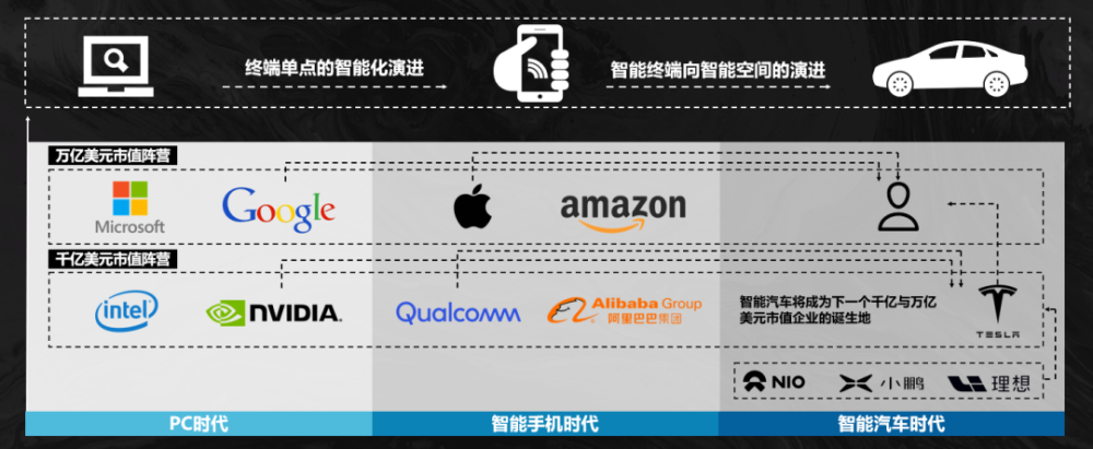 这种更加紧密的联接,让智能手机爆发出巨大的价值,也涌现了一批以苹果为代表的万亿、千亿美元市值的企业。而当新的智能终端——智能汽车出现时,自然也会受到资本的追捧,海外有特斯拉,国内则是以蔚来,小鹏和理想为代表的造车新势力。它们的出现,也承载了诞生下一个万亿美元市值企业的期望。
