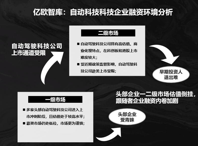 从当前的二级市场来看,自动驾驶科技公司因自身具有的高估值以及商业化特点,一般更多选择在美股上市,而伴随当前监管、政策、市场等多重因素影响,短期内头部自动驾驶科技公司上市通道受限,早期投资人退出难,而自动驾驶科技公司的高估值导致新投资人难进入,自动驾驶科技公司在一二级市场估值出现倒挂。这是头部企业面临的情况。