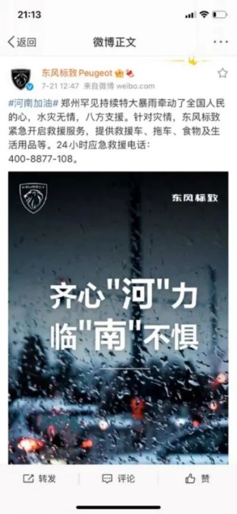 事情起因源自东风标致官方于当日12时47分,在社交媒体发布的题为“河南加油”,表示可为雨灾提供救援的相关内容。