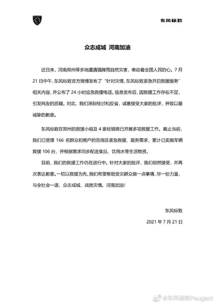 据财经网汽车频道报道,因涉及7月20日郑州暴雨物资救援问题,东风标致舆论翻车。
