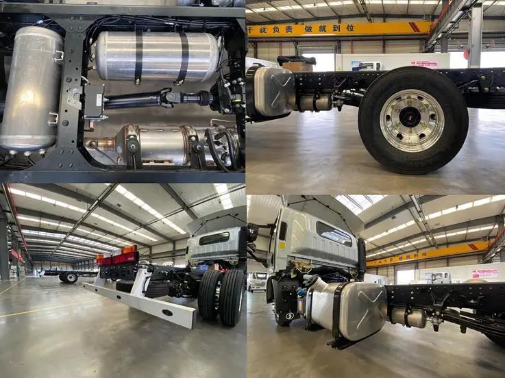 整车轻量化程度在量产车中可以用极致来形容,储气筒、全车七个轮辋、油箱、后防护梁、甚至是后期上装用的箱子和副车架,全部采用铝合金材质。全车轮胎为子午线真空胎。这些配置约为后期成品车减重约500Kg,有效的减重就意味着可以增加承载能力,标载运输更有优势。