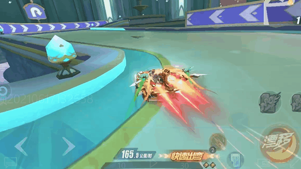 此处右侧分岔路看似有台阶能蹭小喷,但总路程较长,所以选择向左走下面分岔路。前一个弯道尽量使用弹射甩尾,以保证氮气能在下个弯道进行延续。