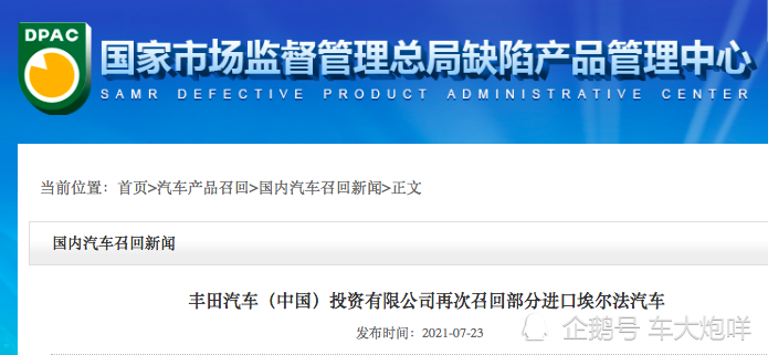 7月23日,笔者从国家市场监督管理总局缺陷产品中心了解到,丰田汽车以及旗下的一汽丰田和广汽丰田均根据相关法律法规的要求,向国家市场监督管理总局备案了召回计划。此次涉及车型包括进口埃尔法,以及雷凌双擎和卡罗拉双擎两款炙手可热的紧凑型轿车,总计召回存在安全隐患的汽车数量为238540辆。