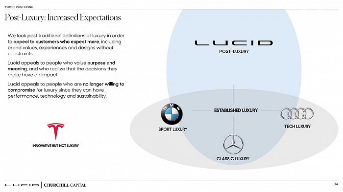 Lucid自我定位为“post-luxury brand”,即后豪华汽车品牌,对手特斯拉则被定义为“innovative but not luxury”,创新但不豪华。