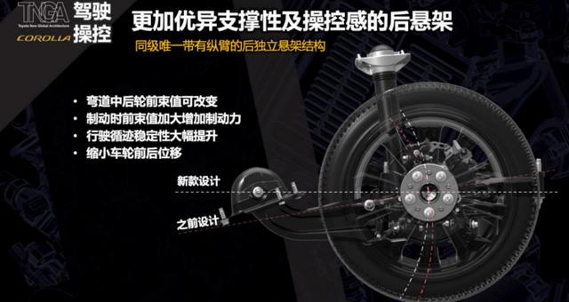 而为了提升车辆的操控感,全新一代卡罗拉实现了从扭力梁非独立后悬架到双叉臂式独立后悬架的升级,配合纵臂的悬架结构,能够让车辆的行驶轨迹稳定性得到提升,并且缩小车轮前后位移,从而提升车辆的操控性。
