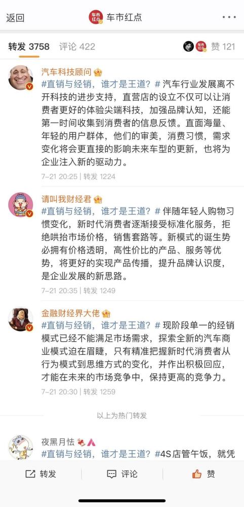 昨天关于直销+经销模式那种更适合现在汽车行业发展的话题,受到广大网友的投票热议,其中还有不少媒体发表了独特观点,直销or经销究竟那种更适合现在行业发展,或者有第三种方式的出现打破目前的局面,跟随讨论风口我们一探究竟。