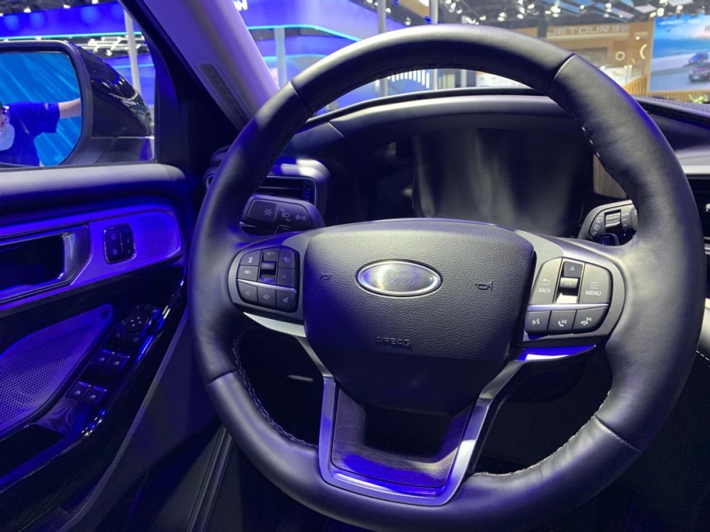 真皮包裹的方向盘抓握感非常细腻,两侧还进行了防滑打孔处理,多个功能按键键使用起来方便。全液晶仪表盘的显示效果细腻,信息易读取,驾驶模式分为六种,分别为标准/运动/雪地/沙地/经济/简陋地面模式,根据不同驾驶模式的切换,仪表盘的主题也会随之切换,在运动模式下,仪表盘的主题风格倒也有些福特性能车的感觉。