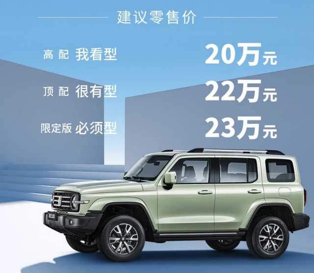 7月23日, 坦克300城市版正式上市,新车共推出 “我看型”、“很有型”以及“必须型”三种配置,其官方价格分别为20.00万元、22.00万元和23.00万元,坦克300城市版“必须型”采用每月限量形式发售。相对来说,坦克品牌限不限量,都是“限量”。
