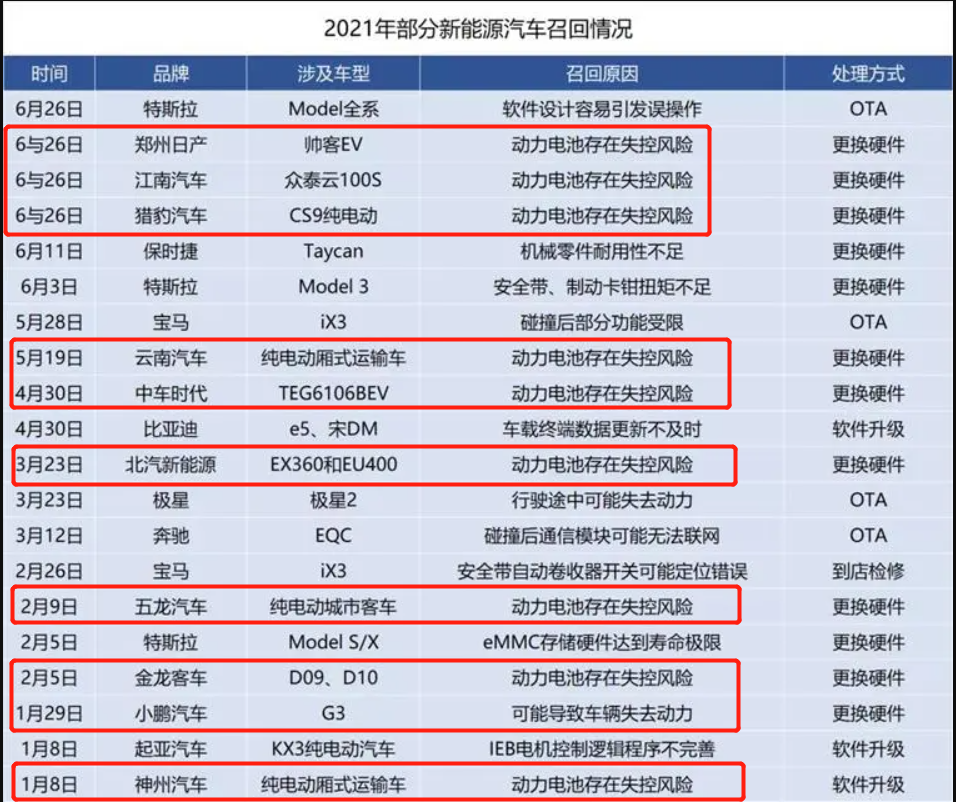 今年上半年,有车辆召回动作的电动车车企超过20家,其中有超过一半的原因都是“动力电池存在失控风险”。