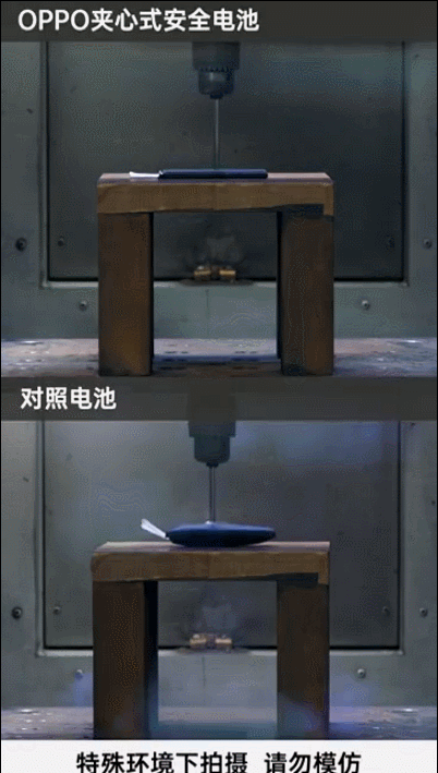 在 OPPO 实验室的实际测试中,这种内部的极致防护,体现在直观层面,就是哪怕重物砸成两半、被针刺穿大洞,透依旧毫无反应,更不会有任何的安全问题。