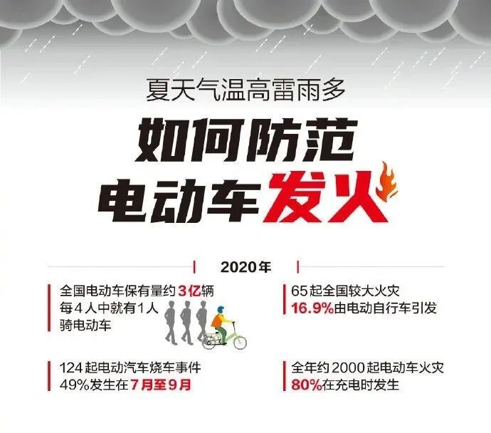 因夏季气温高、雨水多,电动自行车一方面容易升温,另一方面容易进水,发生自燃的概率比其他季节更高。