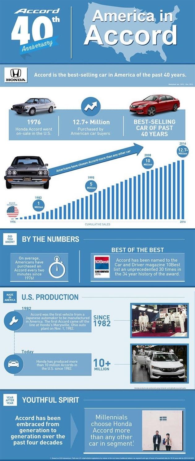 图片概述:自1976年开始,雅阁在北美市场一直表现优异,是过去40年中的北美最畅销车型。截至2016年销量达1270余万,其中1982年后美国本土生产的雅阁销售了超过1000万台,成为了一种代代相传的“精神”和“情怀”。