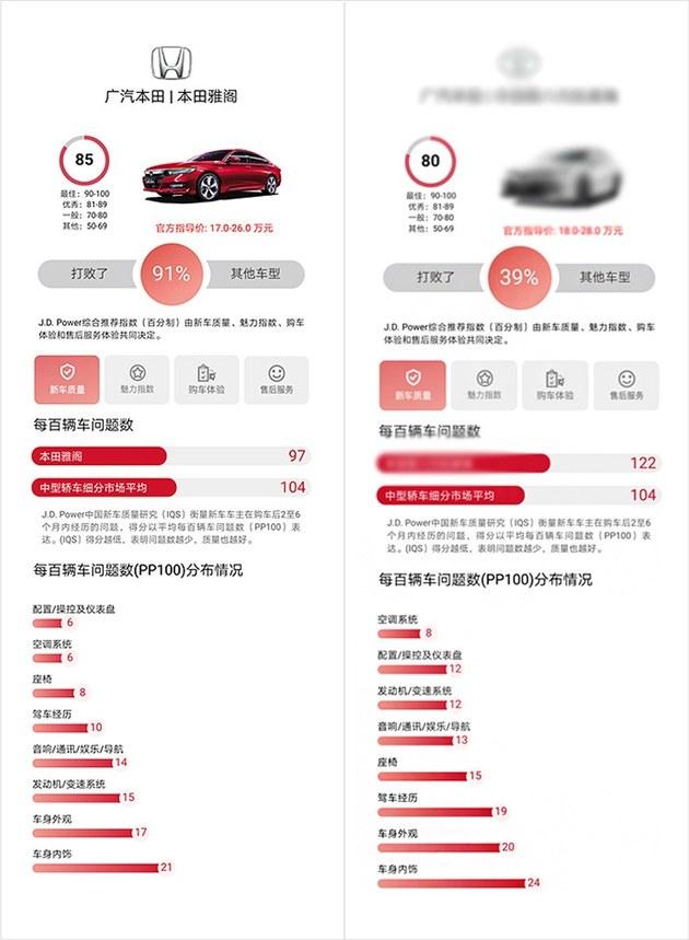 在J.D. Power的质量类研究中,PP100指每百辆车问题数,得分越低,意味着质量越好。在2019年的测试对比研究中,广汽本田以89个PP100,在J.D. Power 2019中国新车质量研究(IQS)中排名主流车品牌第三,比市场上的主流车品牌普遍低8个PP100,较其他品牌有着更为优秀的质量,而本田雅阁更是名列中型高端轿车质量排行第一名!