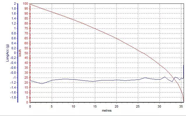 535Le的刹车脚感前半段偏软,需要多踩一点才能达到预期效果,不过整体的制动力还是非常不错的,在刹车测试中,能看到G值非常稳定,最终的成绩也很出色,100km/h-0的刹停距离为36.11米。