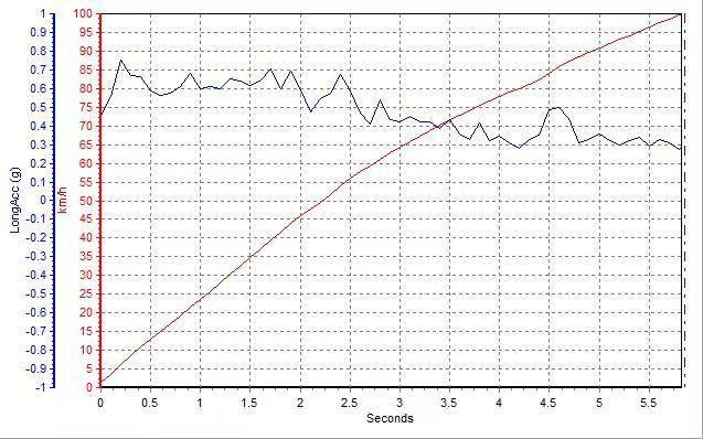 加速测试将电量保持在80%以上,运动模式+S挡,电子稳定系统关闭,2000rpm弹射起步。起步瞬间G值突破0.7g,体感的冲击非常大,并且前半段的G值几乎没有太大的下降,加速势头很足。最终测得这台535Le的0-100km/h加速时间为5.83秒,成绩可见一斑。