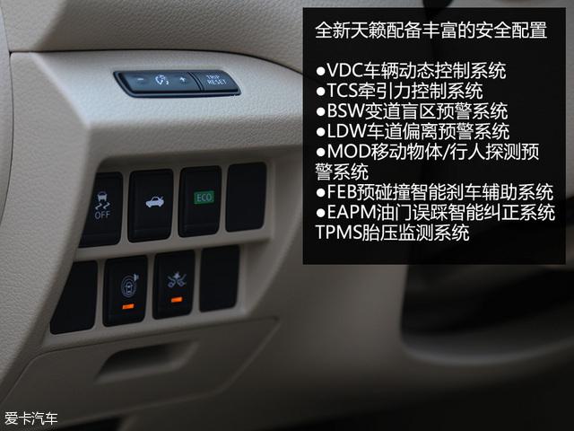 这台最高配的2.0L天籁配备了丰富的安全配置,除了常规的车身稳定系统之外,还有FEB预碰撞智能刹车系统和EAPM油门误踩智能纠正系统。
