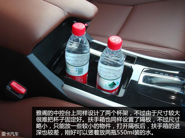 雅阁手套箱的进深比全新天籁略差,此外,前车门、后车门上同样也设置了储物空间,后排扶手上也带有两个杯架。