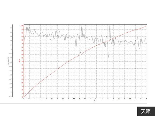 从曲线中可以看出全新天籁的加速十分平顺线性,换挡时几乎没有出现顿挫,最大G值出现在中段,加速成绩为11秒。